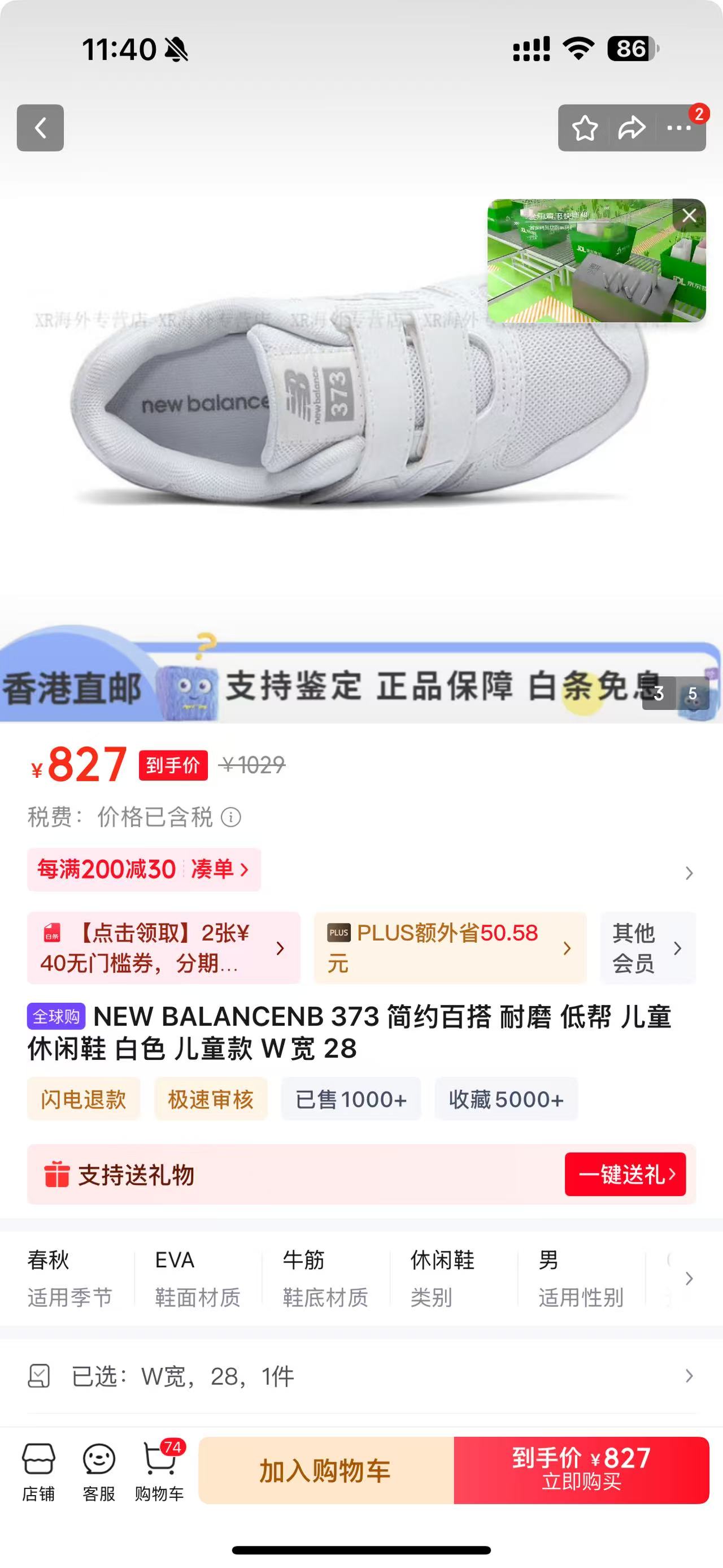 NB373儿童白鞋35码全新200元!